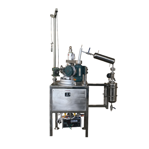 減壓蒸餾反應(yīng)釜是一種快速將液體介質(zhì)濃縮或分離的裝置,反應(yīng)介質(zhì)在反應(yīng)釜中被加熱至沸點(diǎn)、通過攪拌系統(tǒng)不斷地旋轉(zhuǎn)增大蒸發(fā)表面積,加快蒸發(fā)速度,適當(dāng)?shù)恼婵諚l件使達(dá)到沸點(diǎn)的介質(zhì)快速分離,通過冷凝器冷凝后并收集。